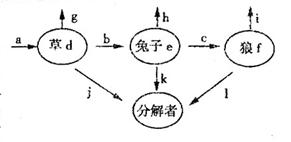 如图为草原生态系统的能量流动图解模型。 a、b、c表示流入各营养级生物的能量,d、e、f表示用于各营养级生物生长、发育、繁殖的能量g、h、i表示各营养级生物呼吸消耗的能量,j、k、I表示流入分解者的能量。