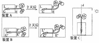 为了探究不同环境下生长素对植物生长的影响,设计了如下实验:装置A花盆横放在某一光照强度的地方;装置B花盆横放在一个不透光的木箱内;装置C花盆摆放在一个有小孔的木箱中(G、E,G′、E′表示近地侧,L、F,L′、F′表示远地侧)。请回答下列问题: