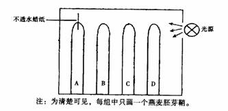 实验材料:直立生长的燕麦胚芽鞘若干、不透水的蜡纸(可插入胚芽鞘)、台灯、一侧开孔的不透光纸盒等。