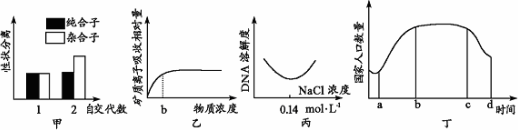 摘要:3.对下图所示曲线表示的生物意义的叙述.错误的是 A.甲图表示具有一对相对性状的杂合子植株自交1代及自交2代纯合子与杂合子的比例 B.由乙图可知.b点以后载体数量是限制根细胞吸收矿质离子的因素之一 C.由丙图可知.含DNA的黏稠物析出量不再增加时.溶液中NaCl的浓度相当于0.14 mol·L-1 D.丁图中若表示一个国家人口数量随时间变化时,在a-b段该国老年人口数量比例较小