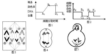 (5)若图1纵坐标是细胞周期中细胞核内的DNA数,则图3~图5中哪个细胞的DNA含量与图1中D1E1段的相等? 。