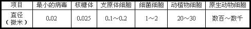 下表为病毒、细胞及其它结构的大小,分析表格数据,指出原核细胞直径大小范围