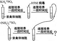 有人试图通过实验来了解H5N1型禽流感病毒侵染家禽的过程,设计实验如右图所示:一段时间后,检测子代H5N1型禽流感病毒的放射性及S、P元素,下表结果的预测中,最可能发生的是 ( )