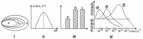 摘要:对图中I.II.III.IV四幅图的描述正确的是: A.图I中a.b.c.d可依次表示碱基.脱氧核苷酸.基因和DNA B.图II可表示pH对酶催化活性的影响 C.图III中a.b.c可表示某一细胞在有丝分裂后期的染色体.染色单体和DNA D.图IV表示某一株植物的不同器官对不同浓度的生长素的反应