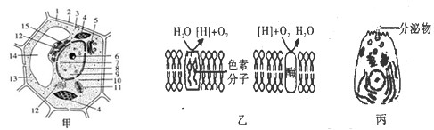 甲图为某植物细胞的亚显微结构模式图;乙图为甲中的两种膜结构,以及发生的生化反应:丙图为某高等动物分泌细胞。下列有关叙述正确的是