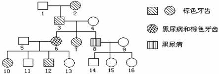 有两种罕见的家族遗传病,它们的致病基因分别位于常染色体和性染色体上。一种先天代谢病称为黑尿病(A,a),病人的尿在空气中一段时间后,就会变黑。另一种因缺少珐琅质而牙齿为棕色(B,b)。如图为一家族遗传图谱。