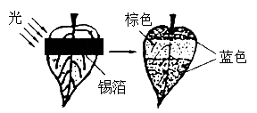 如图所示,某植物的绿叶经光照24h后,然后脱色用碘处理,结果有锡箔覆盖的位置不呈蓝色,而不被锡箔覆盖的部位呈蓝色。该实验证明