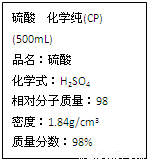 | A.该硫酸的物质的量浓度为9.2mol?L-1 |