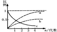 摘要:7. 将基因型为Aa的豌豆连续自交后代中的纯合子和杂合子按所占的比例做得如图所示曲线图.据图分析.不正确的说法是( ) A.a曲线可代表自交n代后纯合子所占的比例 B.b曲线可代表自交n代后显性纯合子所占的比例 C.隐性纯合子的比例比b曲线所对应的比例要小 D.c曲线可代表杂合子随自交代数的变化 解析:具有一对相对性状的杂合子自交.后代中纯合子的比例随自交代数的增加而增大.最终接近1.且显性纯合子和隐性纯合子各占一半.杂合子则随自交代数的增加而递减.最终接近于零. 答案:C