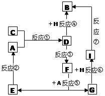 (10分) A、B、C、D、E、F、G七种物质间存在如图所示转化关系,其中A、B、D、G含有同种元素。已知:A为金属单质,C为黄绿色气体;D能将某种非金属氧化物氧化为F,F是含有三种元素的化合物。请回答下列问题:![]()
