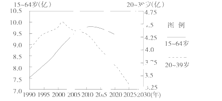 查看习题详情和答案>>“刘易斯拐点”是指劳动力由过剩向短缺的转折点,新就业人口主要集中在20~39岁年龄段。下图为我国劳动力数量变化及预测情况,据图回答27~28题。