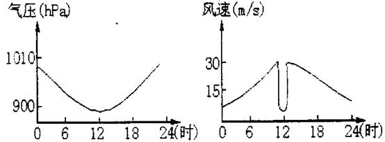 下图是“我国某天气系统在某地过境时的气压与风速随时间的变化规律示意图”,分析判断23~24题。