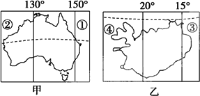 A、甲地跨南北半球,乙地跨东西半球