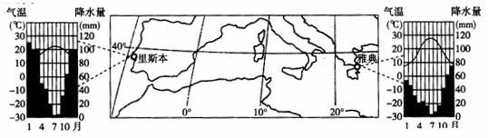 由于所处的气压带和风带的不同,加上海陆分布、地形等因素的影响,地球上不同的地域气候类型不同,同一气候类型也有各种不同的成因。阅读所给的世界部分区域气候图和四地多年平均降水量(mm)等图文资料,回答相关问题。(15分)