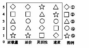 (纵坐标1~5代表各种运输方式四项指标的,由优到劣的大体次序,①~⑤代表五种运输方式)