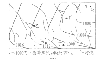 C.丙地吹东南风,降水概率较大 D.丁地吹偏西风.晴朗少云