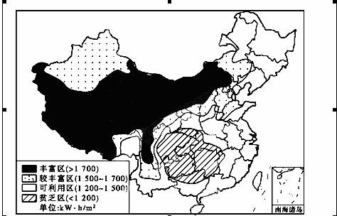 下图是“我国太阳年辐射总量的分布图”,读图,完成13~14题。