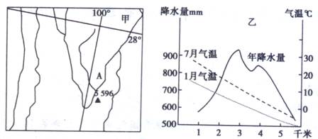 图2中甲图为我国某区域图,乙图为甲图中5596山地的气温、降水与高度的关系。回答21—24题。