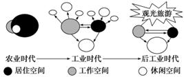 人们日常的活动空间,大体可分为居住、工作、休闲三类,每一类活动的空间规模与当地社会经济的发展息息相关。下图表示从农业时代工业时代、向后工业时代演化过程中,居住空间、工作空间、休闲空间的变化情况。据此回答(1)~(2)题。