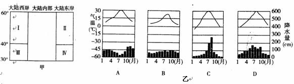 C.丙分布在大陆西岸 D.丁雨热同期