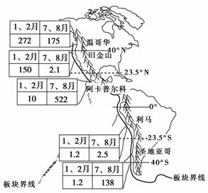 下图是“美洲大陆略图”。美洲大陆西部有世界上最长的科迪勒拉山系,它像一堵墙壁阻隔了东西水汽交换。图上表格中是西海岸部分地区1、2月和7、8月降水资料(单位:mm)。读图回答以下问题。
