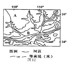 图12为我国局部区域等高线图,ABC为不同地形单元,据此回答下列问题。(10分)