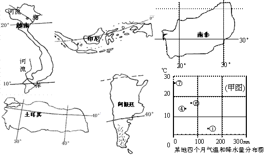 (2)甲图代表的气候类型是 ,五国中有 个国家分布有该气候类型,这种气候对农业生产的不利因素是什么?(3分)