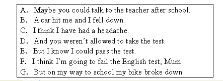 | M: What's wrong with you, Linda? You look unhappy. W: (1)__________________________________________. M: Really? What happened to you? W: Well. I walked to school… M: Why? Didn't you go to school by bike? W: At first, I rode my bike. (2)______________________. I couldn't repair it. M: So you were late for school! W: I'm not allowed to go to class late, and there was a big test today. M: (3)___________________________________? W: That's right. (4)_____________________________________________ M: Well, Linda, the school has to have rules you know. W: I know. But I should be allowed to take the test later. It's not fair. M: I agree. (5)______________________________________________ W: Yes. Maybe she'll understand, if I explain what has happened.