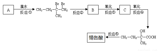 (9分)惕各酸的分子式为C5H8O2,且含有两个甲基,它是生产某种香精的中间体。为了合成该物质,某实验室的科技人员设计了下列合成路线:![]()