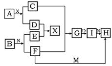 (6分)在下列中学化学中常见物质的转化关系图中,已知常温下A为淡黄色固体化合物、B为金属单质,D、E、M是常见气体单质,其中I为红褐色固体,M为黄绿色,N是胃酸的主要成分,工业上用E和M来制取N,试推断:![]()