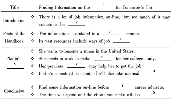 | Many people need guidance in choosing a career (职业). Fortunately, there is much information on the Web about job opportunities (机会). With all the information available, it's not surprising that people can feel confused. So if you're ready to start your first job or change careers, where do you begin? The Occupation Handbook is a good resource. Regularly updated, the Handbook is available as a book and on-line. Not only is information provided about the United States as a whole, but readers can easily search for information about their particular state. You can read about the fastest-growing occupations in the area where you live and find out what they are like. You can also learn how to apply for jobs. Take, for example, Nadia's situation. Nadia was a doctor's assistant in Iran, and her goal in the United States is to become a nurse. However, she needs to work while she is studying nursing. She is interested in becoming a medical assistant to help work her way through college. When going on-line to the Handbook and searching under "medical assistant", Nadia is happy to read that this is expected to be one of the fastest- growing careers through 2010. Besides, job opportunities are even better for people with experience. She discovers that medical assistants not only have to do some office work, but have medical responsibilities as well. Nadia decides this job will be interesting and will also provide excellent experience for her nursing career. The Occupation Handbook is just an example of websites that can help you plan a new career. When you have found information about some different careers, you will be ready to talk to career advisers. Choosing your future career is an extremely important decision. It's worth taking the time and finding as much information as you can. | ||||||||||