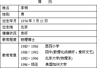 你的好友正在美国加州大学攻读物理专业,明年初夏将回国就职.请你给北京人才交流中心写封信,介绍他的情况和要求,下面是他的简历.