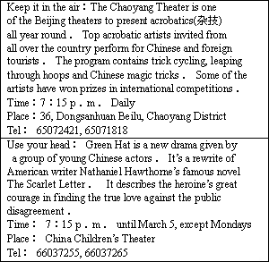 | Keep it in the air: The Chaoyang Theater is one of the Beijing theaters to present acrobatics(杂技 ) all year round.Top acrobatic artists invited from all over the country perform for Chinese and foreign tourists.The program contains trick cycling, leaping through hoops and Chinese magic tricks.Some of the artists have won prizes in international competitions. Time: 7∶15 p.m.Daily Place: 36, Dongsanhuan Beilu, Chaoyang District Tel: 65072421, 65071818 |