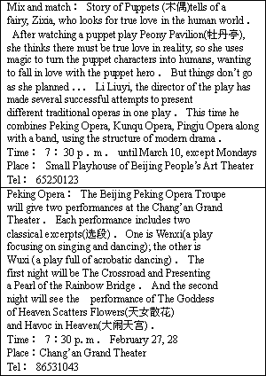 | Peking Opera: The Beijing Peking Opera Troupe will give two performances at the Chang’an Grand Theater.Each performance includes two classical excerpts(选段).One is Wenxi(a play focusing on singing and dancing); the other is Wuxi (a play full of acrobatic dancing).The first night will be The Crossroad and Presenting a Pearl of the Rainbow Bridge.And the second night will see the performance of The Goddess of Heaven Scatters Flowers and Havoc in Heaven. Time: 7∶30 p.m.February 27, 28 Place:Chang’an Grand Theater Tel: 86531043 |