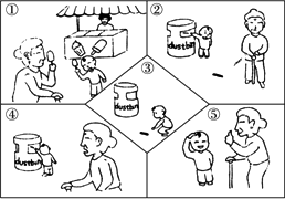 建设和谐社会,需要良好的社会道德规范和文明习惯。下列一组图画描述的是小明和奶奶的一段亲身经历,请据此写一篇短文,展示身边的这些“小事情”和“大道理”(和谐的harmonious)