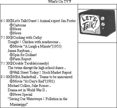 6:00 ③Let’s talk! Guest: Animal expert Jim Porter ⑤Cartoons ⑧News ⑨News 7:00 ③Cooking with Cathy Tonight: Chicken with mushrooms. ⑤Movie “A laugh a Minute”(1955) James Rayburn. ⑧Spin for Dollars! ⑨Farm Report 7:30 ③Double Trouble(comedy) The twins disrupt the high school dance. ⑨Wall Street Today: Stock Market Report 8:00 ③NBA Basketball. Teams to be announced ⑧Movie “At day’s End”(1981) Michael Collier, Julie Romer. Drama set in World WarⅡ. ⑨News Special “Saving Our Waterways: Pollution in the |