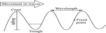 Here, wavelength is the distance between two high points (crests), frequency means the number of cycles per second.