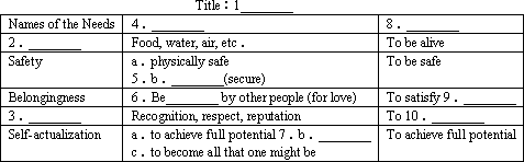 | Self- actualization | a).achieving full potential b).actualizing oneself c).becoming all that one might be | To 85.______ full potential |