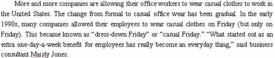 More and more companies are allowing their office workers to wear casual clothes to work. In the United States, the changes from formal to casual office wear have been slow. In the early 1990s, many companies allowed their workers to wear casual clothes on Friday (but only on Friday).This became known as “dress-down Friday” or “casual Friday”. “What started out as an extra one-day-a-week benefit for workers has really become an everyday thing,” said business adviser Maisly Jones.