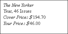 The New Yorker is the eclectic magazine for readers interested in the arts, current events, and culture. The New Yorker includes articles on domestic and international news, exploring current ideas and trends, plus sports, fashion, and entertainment events. In addition, The New Yorker is well known for publishing outstanding short fiction and cartoons with an ironic twist.![]()