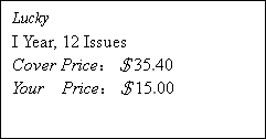 Lucky is the ultimate shopping magazine with the best looks, the best buys, and the best trends before they hit the stores. But what makes it really unique is all the detailed information you’ll get on how to purchase the merchandise (商品) you’ll find. Lucky provides you with 800 numbers, web site addresses, and more to make your shopping experience easy and convenient! Lucky is your one-stop shopping guide to all the greatest new products on the market. What’s more, it provides wonderful entertainment for women.