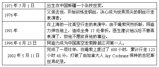 请根据下面的时间线索,介绍中国的“高空王子”阿迪力.