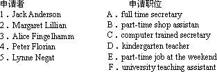 信息匹配 首先,请阅读下列的应用文: a.Needed: Full time secretary position available. Applicants should have at least 2 years experience and be able to type 60 words a minute. No computer skills required. Apply in person at United Business Ltd.. 17 Browning Street. b.Are you looking for a part time job? We require 3 part time shop assistants to work during the evening. No experience required. Applicants should be between 18 and 26. Call 366-76564 for more information. c.Computer trained secretaries: Do you have experience working with computers? Would you like a full time position working in an exciting new company? If your answer is yes, give us a call at 457-896754 d.Teacher Needed: Tommy’s Kindergarten needs 2 teachers/trainers to help with classes from 9 a.m to 3 p.m. Applicants should have appropriate licenses. For more information visit Tommy’s Kindergarten in Leicester Square No.56. e.Part Time work available: We are looking for retired adults who would like to work part time at the weekend. Responsibilities include answering the telephone and giving customers information. For more information contact us by calling 345-674132 f.University positions open: The University of Cumberland is looking for 4 teaching assistants to help with homework correction. Applicants should have a degree in one of the following: Political Science, Religion, Economics or History. Please contact the University of Cumberland for more information. 请阅读以下职位申请者的信息,然后匹配申请者和他/她拟要申请的职位: Jack Anderson. Jack graduated form the University of Trent with a degree in Economics two years ago. He would like an academic position. Margaret Lillian. Margaret is 21 years old and would like a part time position to help her pay her university expenses. She can only work in the evenings. Alice Fingelhamm. Alice was trained as a secretary and has six years of experience. She is an excellent typist but does not know how to use a computer. She is looking for a full time position. Peter Florian. Peter went to business school and studied computer and secretarial skills. He is looking for his first job and would like a full time position. Lynne Nagata. Lynne, aged 65, once worked in a kindergarten. She is now a housewife, helping her daughter with her housework on weekdays. She is looking for a part time job.