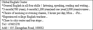 | Global English Centre ※ General English in all four skills: listening, speaking, reading, and writing. ※ 3-month (700 yuan), 6-month (1,200 yuan) and one-year (2,000 yuan) courses. ※ Choice of morning or evening classes, 3 hours per day, Mon—Fri. ※ Experienced college English teachers. ※ Close to city center and bus stops. Tel: 67705272 Add: 105 Ahongshan Road, 100082 |