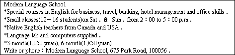 | Modern Language School ☆ Special courses in English for business, travel, banking, hotel management and office skills. ☆ Small classes (12~16 students) on Sat.&Sum.from2:00 to 5:00 p.m. ☆ Native English teachers from Canada and USA. ☆ Language lab and computers supplied. ☆ 3-month course: (1050 yuan), 6-month course: (1850 yuan) Write or phone: Modern Language School, 675 Park Road, 100056 Tel: 67353019 |