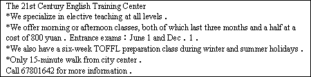 | The 21 sty Century English Training Centre ☆ We specialize in effective teaching at all levels. ☆ We offer morning or afternoon classes, both of which last three months and a half at a cost of 800 yuan. Entrance exams:1 June and 1 Dec. ☆ We also have a six-week TOEFL preparation class during winter and summer holidays. ☆ Only 15-minute walk from city centre. Call 67801642 for more information. |