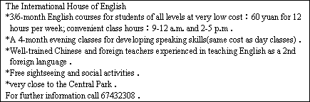 | The International House of English ※ Three/Six-month English courses for students of all levels at very low cost: 60 yuan for 12 hours per week; convenient class hours: 9:00-12:00 a.m. and 2:00-5:00 p.m. ※ A four-month evening programme for developing speaking skills (same cost as day classes) ※ Well-trained Chinese and foreign teachers experienced in teaching English as a second/foreign language. ※ Free sightseeing and social activities. ※ Very close to the Central Park . For further information call 67432308 |