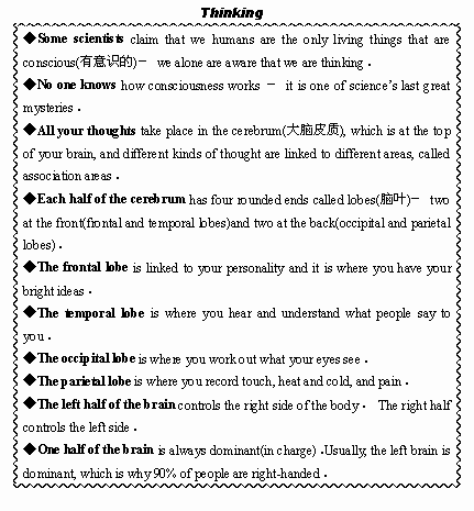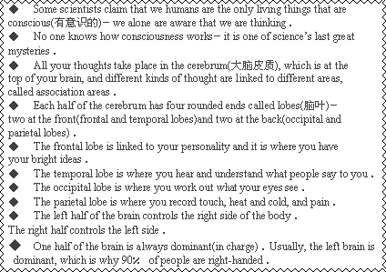 | ·Some scientists claim that we humans are the only living things that are conscious(有意识的)—we alone are aware that we are thinking. ·No one knows how consciousness works—it is one of science’s last great mysteries. ·All your thoughts take place in the cerebrum(大脑皮质),which is at the top of your brain,and different kinds of thought are linked to different areas,called association areas. ·Each half of the cerebrum has four rounded ends called lobes(脑叶)—two at the front(frontal and temporal lobes)and two at the back(occipital and parietal lobes). ·The frontal lobe is linked to your personality and it is where you have your bright ideas. ·The temporal lobe is where you hear and understand what people say to you. ·The occipital lobe is where you work out what your eyes see. ·The parietal lobe is where you record touch,heat and cold,and pain. ·The left half of the brain controls the right side of the body.The right half controls the left side. ·One half of the brain is always dominant(in charge).Usually,the left brain is dominant,which is why 90% of people are right-handed. |