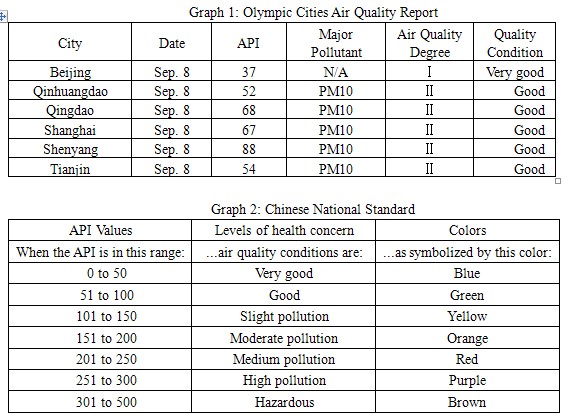 | 阅读理解 China's government has been trying all measures to reduce pollution in the past few years. Now people can enjoy a fresh environment everywhere. The following two graphs are adopted from the column of "City Information" on the webpage of Beijing Review. Graph 1: Olympic Cities Air Quality Report