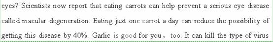 Did your mother ever tell you to eat your carrots because they are good for your eyes? Scientists now report that eating carrots can help prevent a serious eye disease called macular degeneration Eating just one carrot a day can reduce the possibility of getting this disease by 40%. Garlic(蒜)is good for you, too。It can kill the type of virus that causes colds.